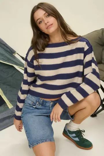 BOAT NECKLINE DROP SHOULDER LONG SLEEVES EXPOSED SEAM DETAIL CROPPED RELAXED FIT STRIPE PATTERN KNIT SWEATER PULLOVER SWEATER 42%ACRYLIC 30%POLYESTER 28%POLYAMIDE