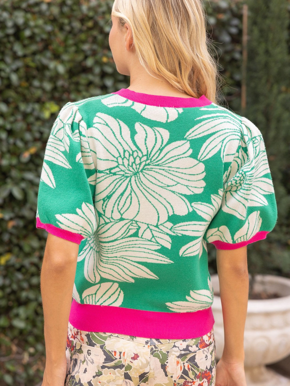 Bold floral knit top featuring an oversized flower pattern, contrast rib band neckline, cuffs, and hem, and short puff sleeves for added volume. Designed in a soft sweater knit with a relaxed fit, this statement pullover delivers eye-catching color contrast and boutique-ready appeal for contemporary collections.