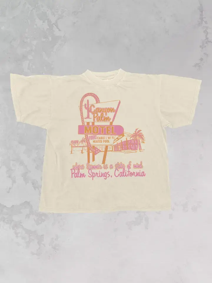 Spend a weekend at the Canyon Palms Motel in this oversized graphic tee. - Features a Motel sign that reads "Canyon Palms Motel" and various motel amenities in a pink and orange ink - Screen print transfer design that is individually heat pressed onto each tshirt - Super soft, vintage wash that gets softer after each wash - 100% Cotton - Oversized fit