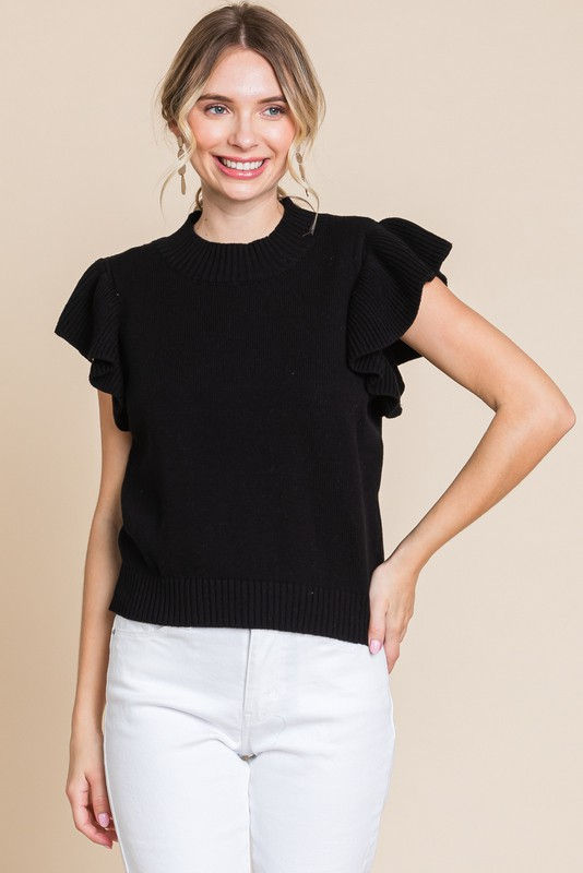 Solid knit top with a crew neck (adjustable stretch), ruffled shoulder, and ribbed hemline. - non-sheer, lightweight. - Model is 5'8'' and is wearing a Small.