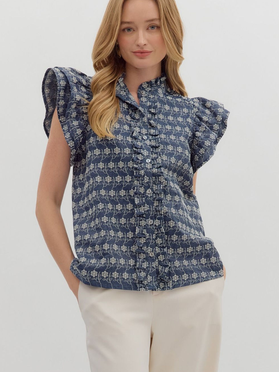 Floral embroidered tiered flutter sleeve top featuring ruffle accented band collar button closure. Unlined. Woven. Non-sheer. Lightweight.