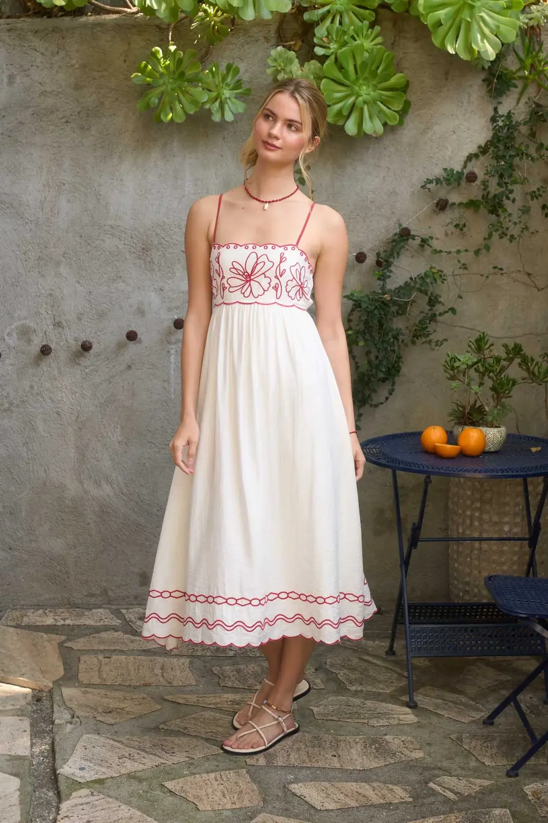 Rooted Cowgirl Boutique presents the Gratitude Embroidered Midi Dress, where rural roots meet modern fashion in perfect harmony. This dress features a scalloped neckline, adjustable spaghetti strap back, and smocking empire waist that flatters every silhouette. Intricate embroidered floral and line patterns adorn the contrast linen blend fabric, while a scalloped hem adds a delicate finishing touch. Crafted with a shell of 77% rayon, 18% nylon, and 5% linen, complemented by a 100% polyester lining, this lined midi dress offers both comfort and style. Celebrate everyday elegance with a piece thoughtfully designed by a mother-daughter team right here in rural Chillicothe, MO.