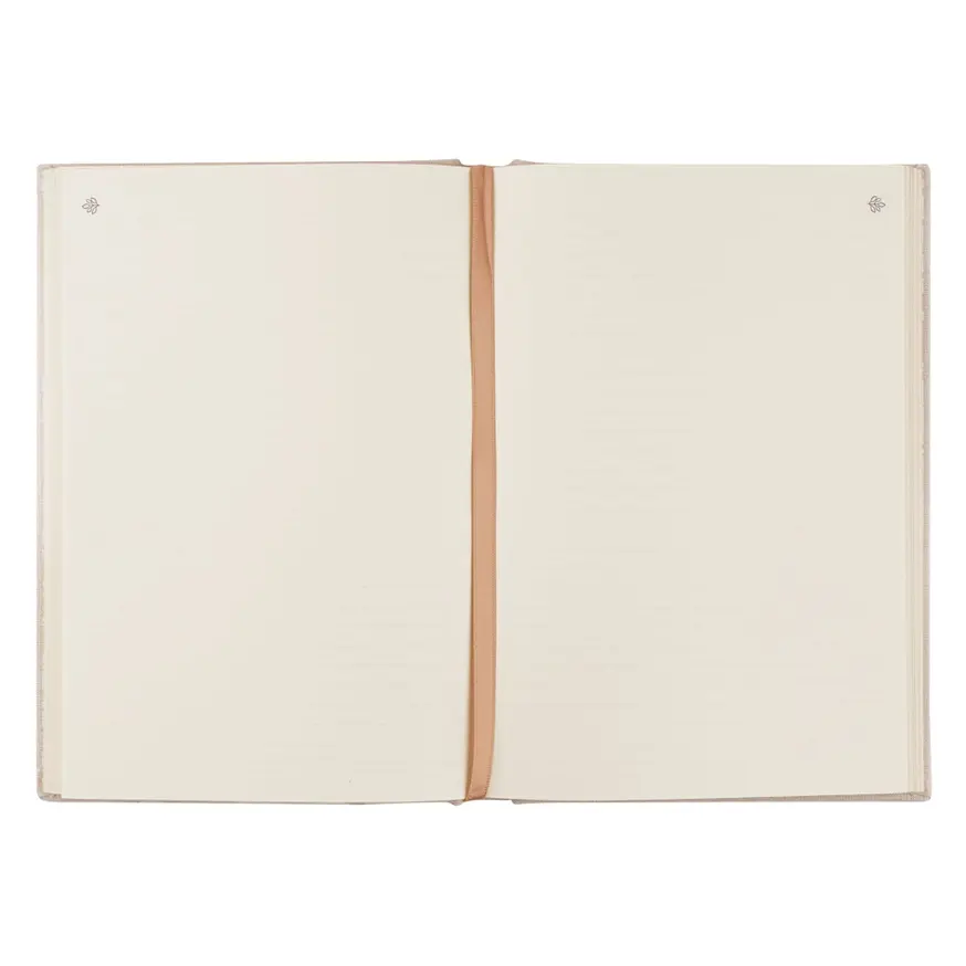 This beautiful notebook features our Casablanca design. Inspired by the town of Casablanca, Morocco, this notebook has a gorgeous, lacey, embroidered floral design, reminiscent of the rich heritage of this town’s textile port. Outlines of delicate, white embroidered magnolias cover this notebook, giving it an elegant and elevated look, while gold-gilded pages give this notebook an extra touch of beauty. The back of this beautiful notebook features a gold-foiled verse, Psalm 51:10, “Create in me a clean heart.” This verse serves as a reminder that when we commune with God, we should desire to be refined by his love and grace.