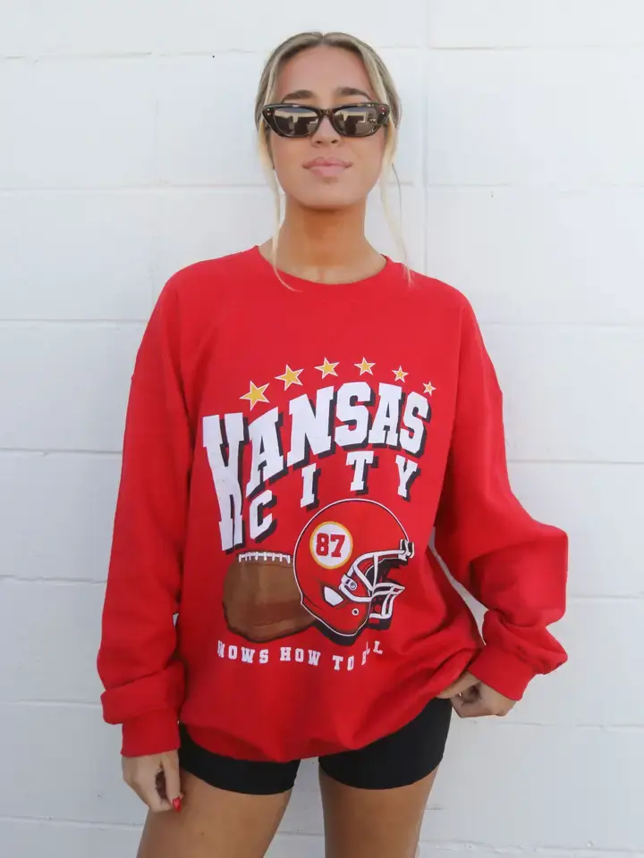 Cheifs fans! Tayvis fans! This one is for you! This red crewneck features a Kansas City football graphic inspired by Taylor's boyfriend! ;)