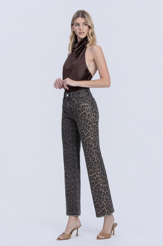 HIGH RISE LEOPARD PRINT SLIM WIDE JEANS COMFORT STRETCH DENIM, HIGH RISE WAIST, 5 POCKETS, FINISHED HEM, FULL LENGTH, LEOPARD PRINT, SLIM WIDE JEANS F. RISE: 10 1/2" / INSEAM: 31" / LEG OPENING: 18 1/2"