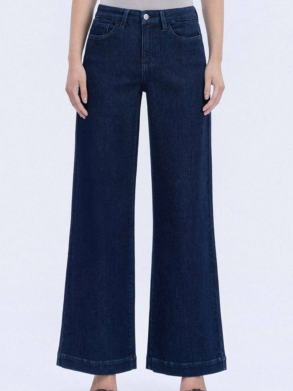 HIGH RISE SEAMLESS WB TROUSER HEM WIDE JEANS COMFORT STRETCH DENIM, HIGH RISE WAIST, SEAMLESS WAISTBAND, TROUSER HEM, FULL LENGTH, DARK WASH, WIDE JEANS F. RISE: 10" / INSEAM: 32" / LEG OPENING: 22"