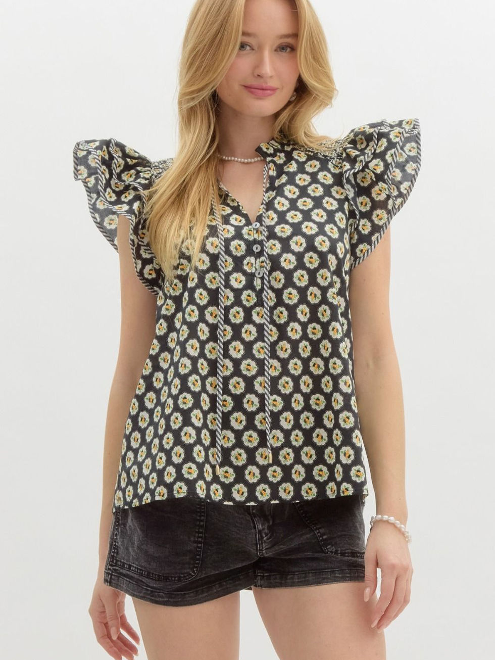 Floral medallion print double layer shoulder ruffle pullover top featuring smocked embroidered shoulder accents along with finished contrasting binding edges. Front button closure. Unlined. Woven. Non-sheer. Lightweight