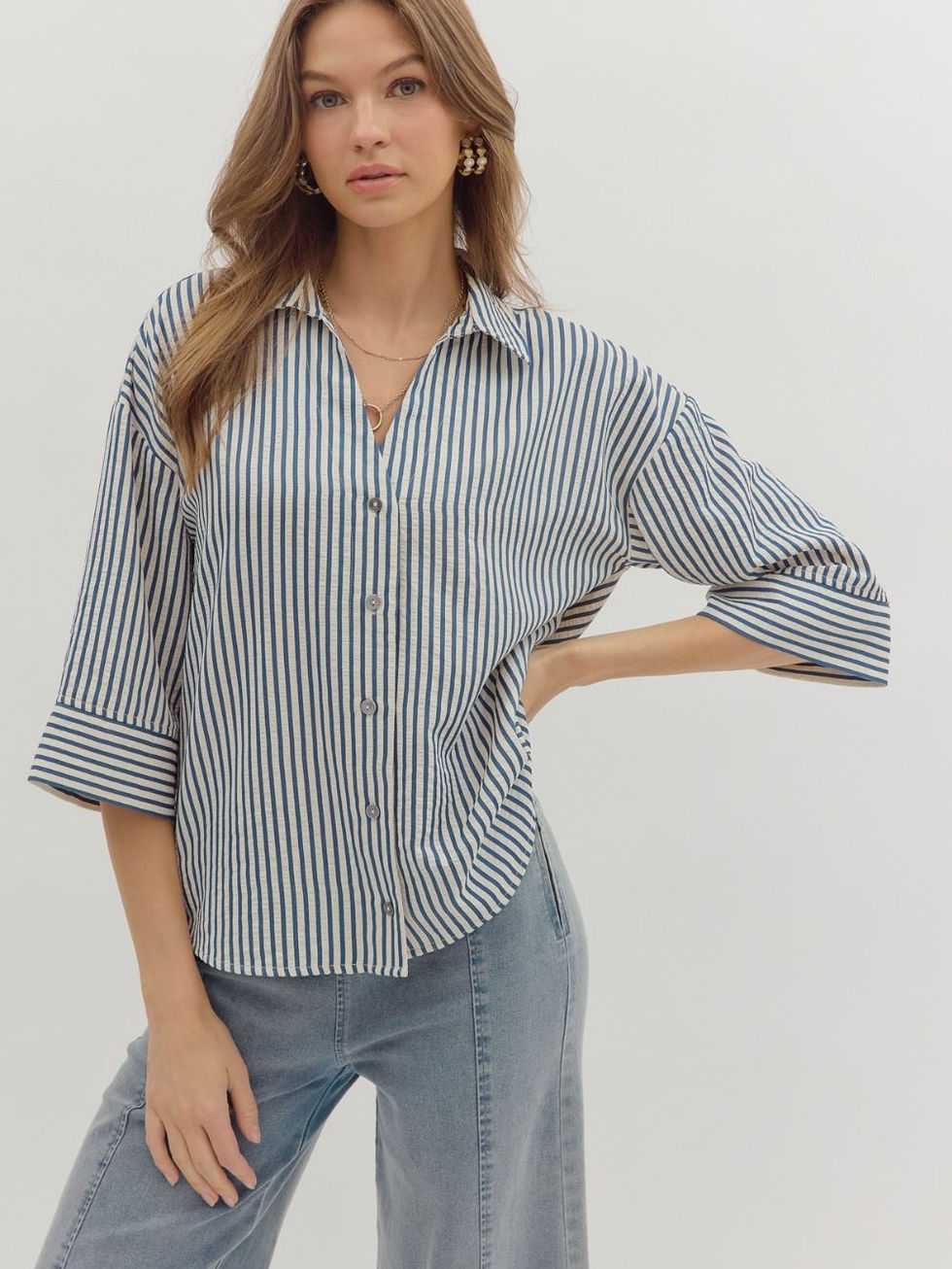 Stripe pattern wide cuff ¾ sleeve spread collar button front closure top. Unlined. Woven. Non-sheer. Lightweight.