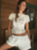 - Soft lightweight knit in a warm ivory tone - Delicate pointelle texture with subtle bobble detailing - Classic crew neckline with tonal covered buttons - Short sleeves with ribbed trim - Cropped silhouette with ribbed hem - Feminine, easy layering piece for skirts or denim - 58% ACRYLIC, 27% POLYESTER, 15% NYLON