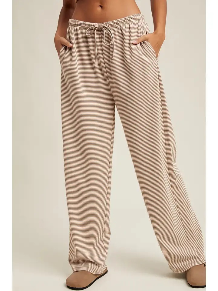 STRIPED KNIT PANTS - ELASTIC WAISTBAND WITH DRAWSTRING - SIDE POCKETS, LOOSE AND COMFORTABLE SMALL: INSEAM LENGTH - 28" MODEL IS WEARING SIZE SMALL. 75% COTTON, 25% RAYON