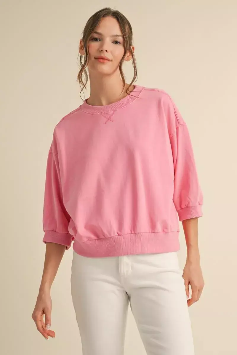 Solid sweatshirts top with crew neck, drop shoulder, three quarter dolman sleeves, ribbing at the sleeve ends and hemline.