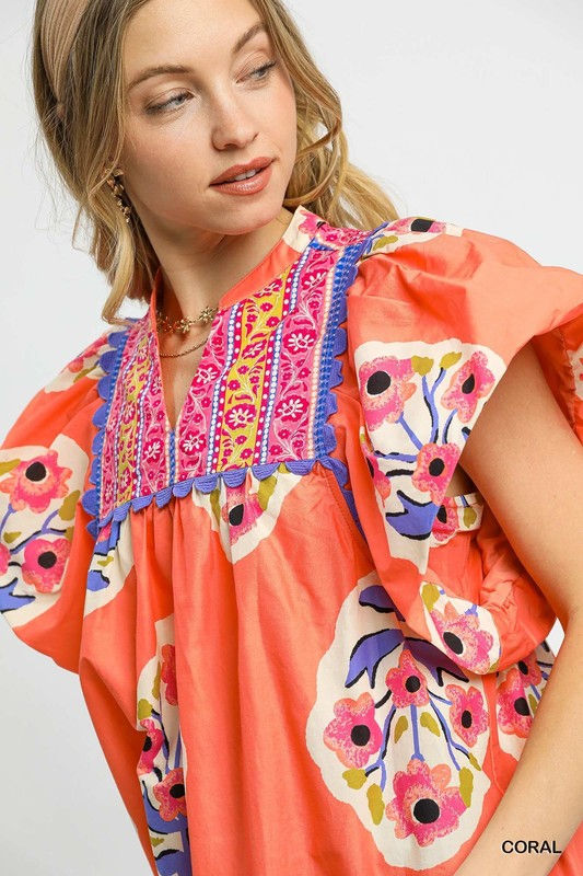 Embroidered scalloped neckline and border hem Flutter sleeves Relaxed fit Not Lined