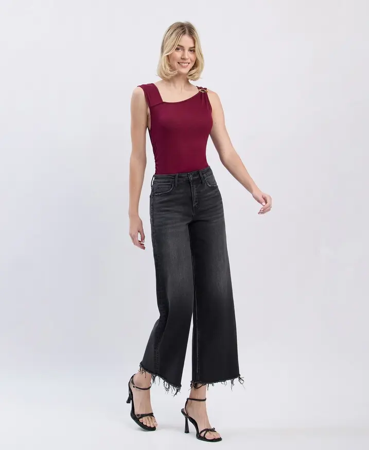 Discover the epitome of rural roots meeting modern fashion with our Stylized Black High Rise Crop from Rooted Cowgirl Boutique. These high-rise frayed hem ankle wide jeans offer a perfect blend of comfort stretch denim, ensuring you stay stylish yet comfortable. With a high rise waist, frayed hem, and ankle-length cut, these jeans are designed to make a statement. Featuring a front rise of 10", an inseam of 28", and a leg opening of 22", they fit beautifully on our 5'10" model wearing a size 26. Shop local and elevate your wardrobe with these versatile and chic jeans.