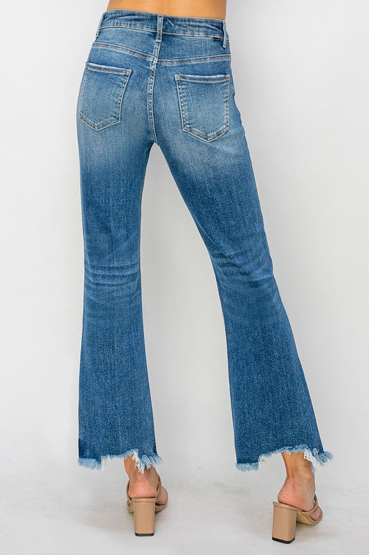 HIGH RISE CROP FLARE FRAY HEM JEANS - Rise 10 1/2" | Inseam 27" in size 3/26 - Model Info: Height 5'8" | Waist 25" | Hips 33 1/2"