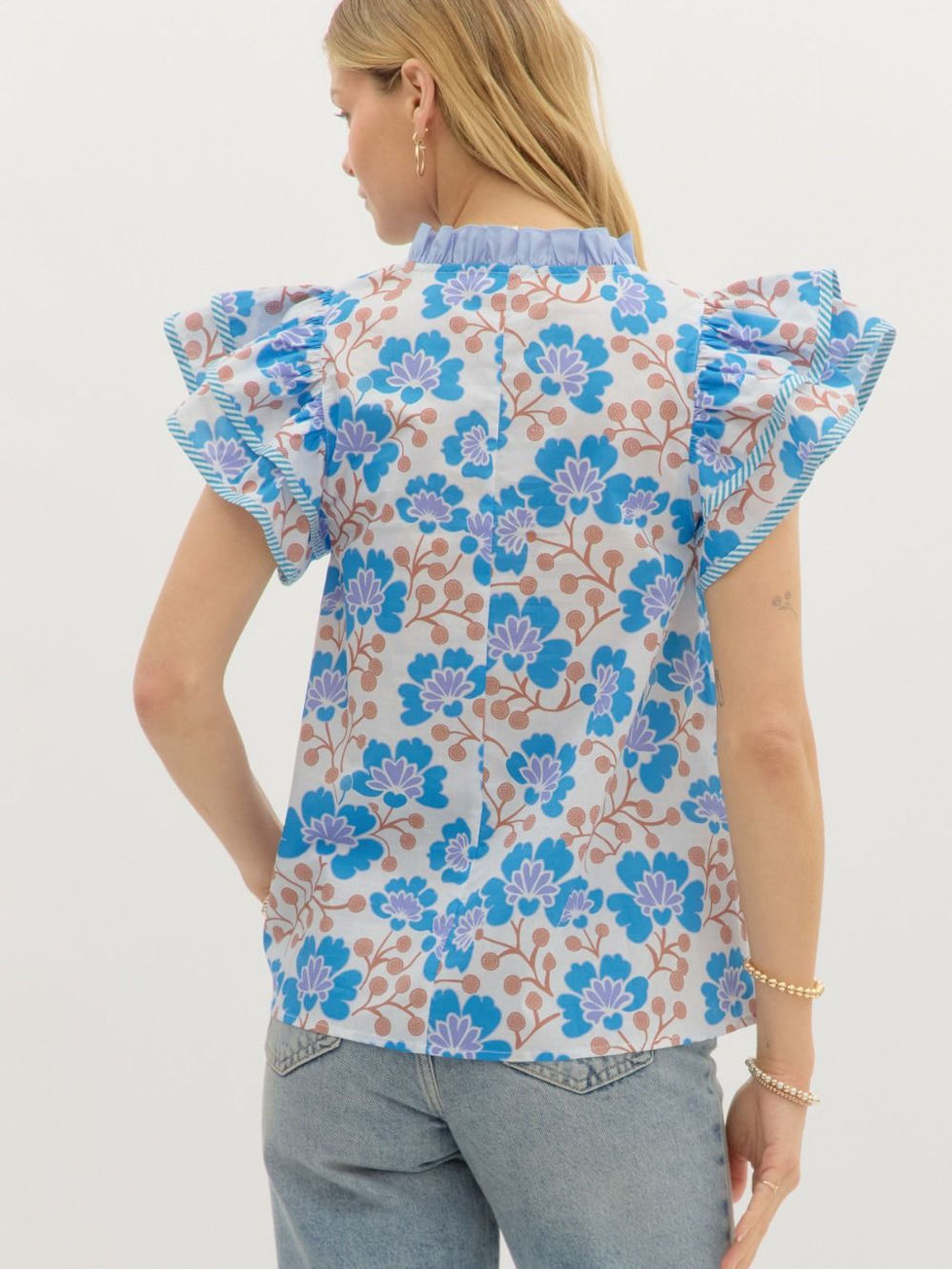 Floral print contrast accent binding finish tiered flutter sleeve pullover top featuring ruffle finish caftan-inspired V-neck. Unlined. Woven. Non-sheer. Lightweight.
